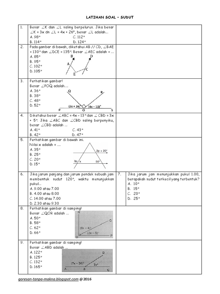 Sudut terkecil yang dibentuk oleh kedua jarum jam pada saat pukul 20.00 adalah. Nilai dan arah arus i. Selanjutnya, ingat bahwa jumlah sudut dalam segi empat adalah 360 o, maka. Soal juga dapat diunduh melalui tautan berikut: Berilah tanda silang ( x ) pada huruf a, b, c atau d di depan jawaban yang paling benar.